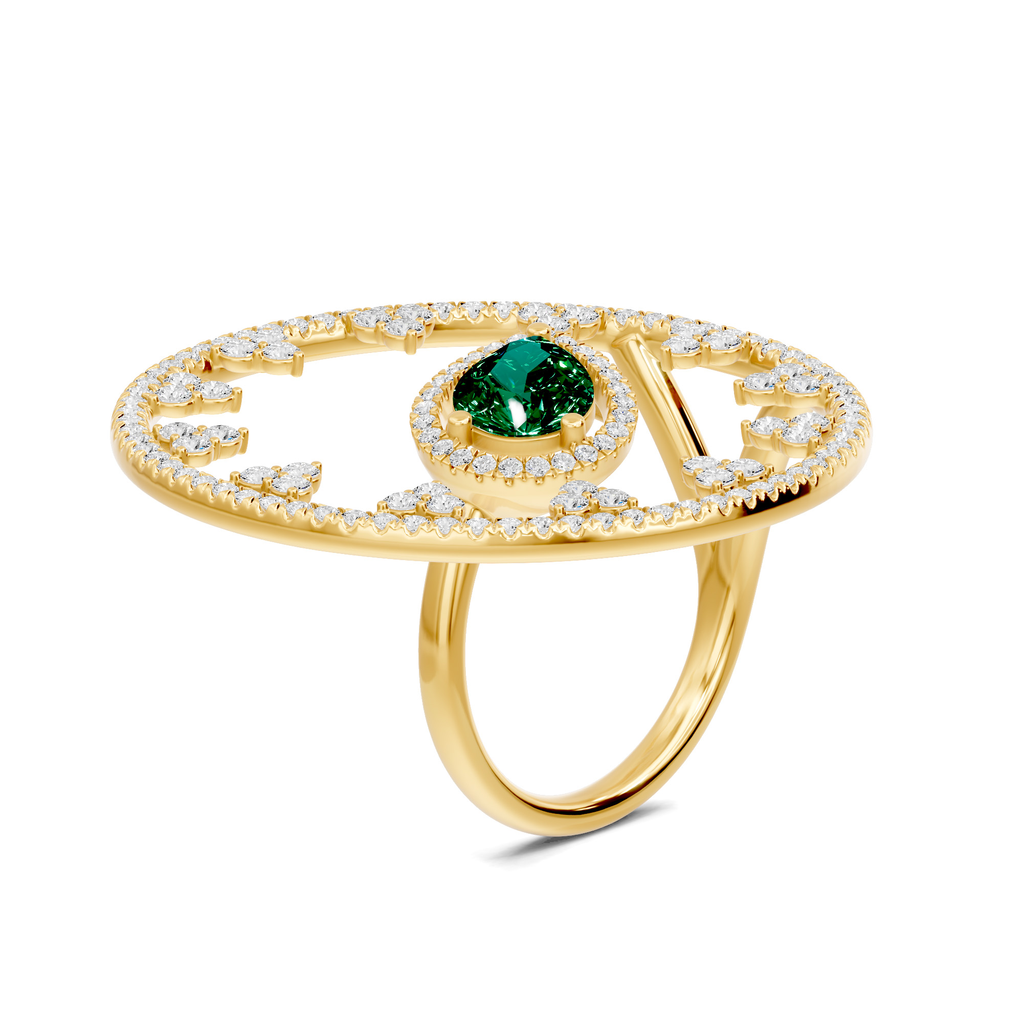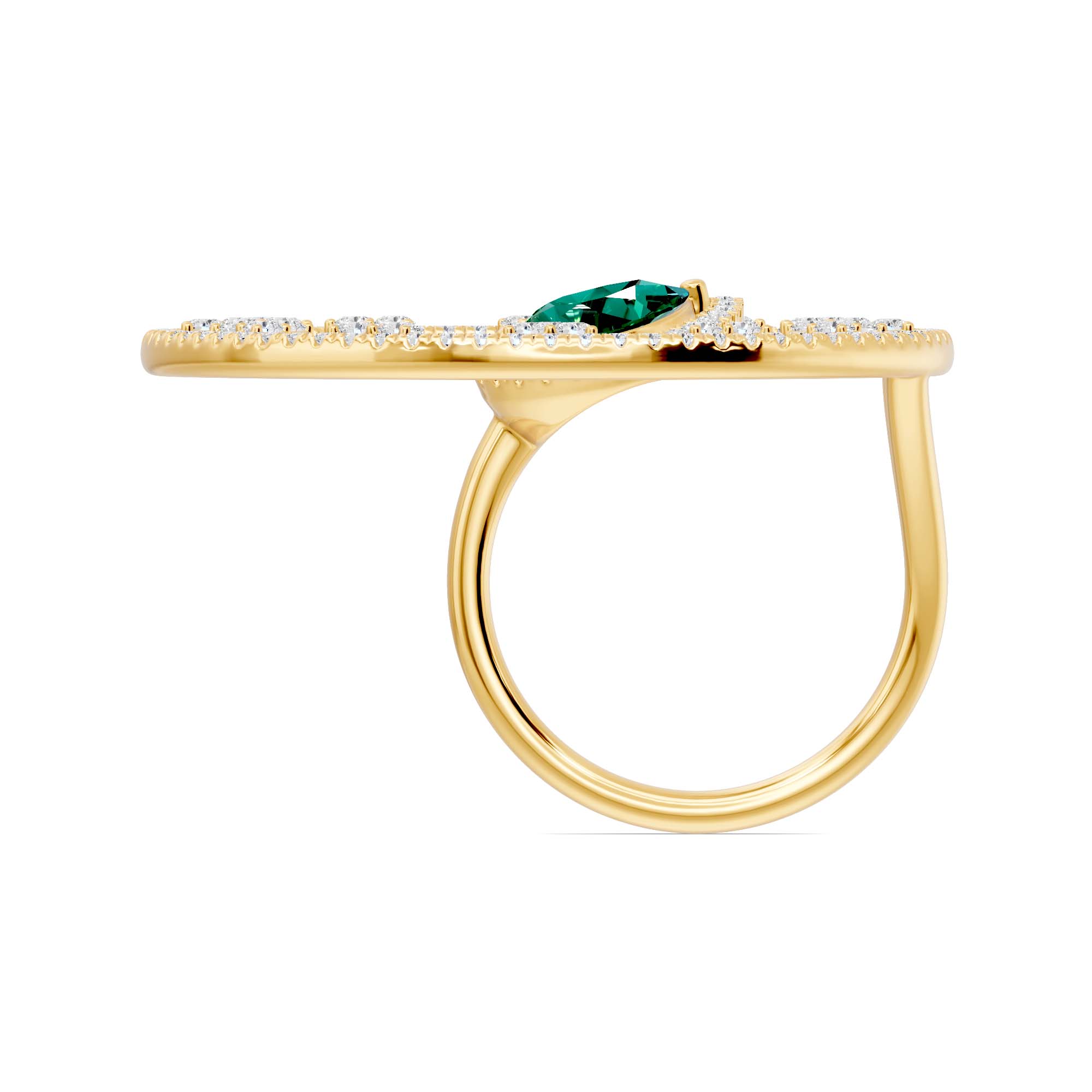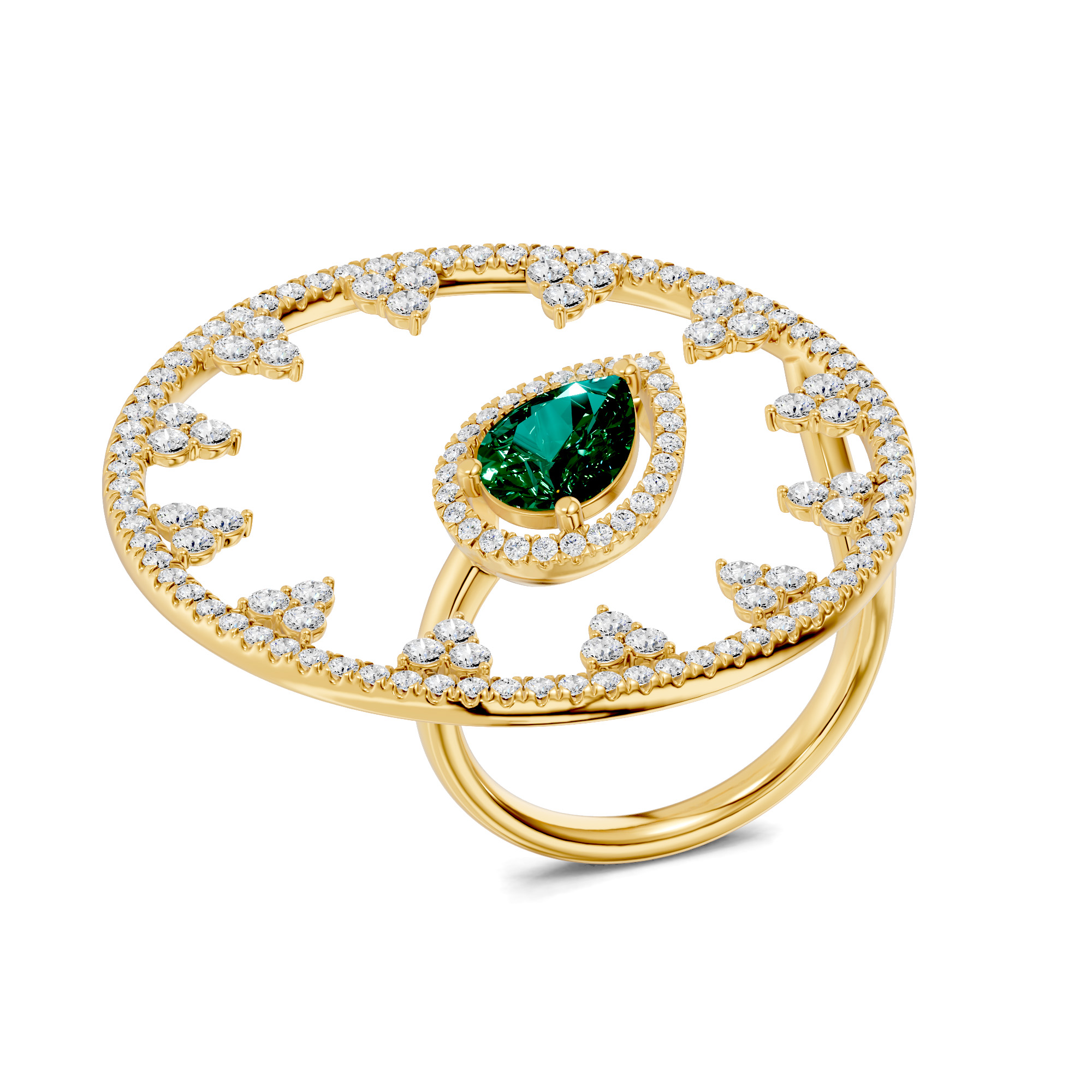 A graceful dual finger ring with a pear-shaped emerald center and round diamonds—perfect for any special occasions to grab the attention of crowd. Also available in ruby and blue sapphire.