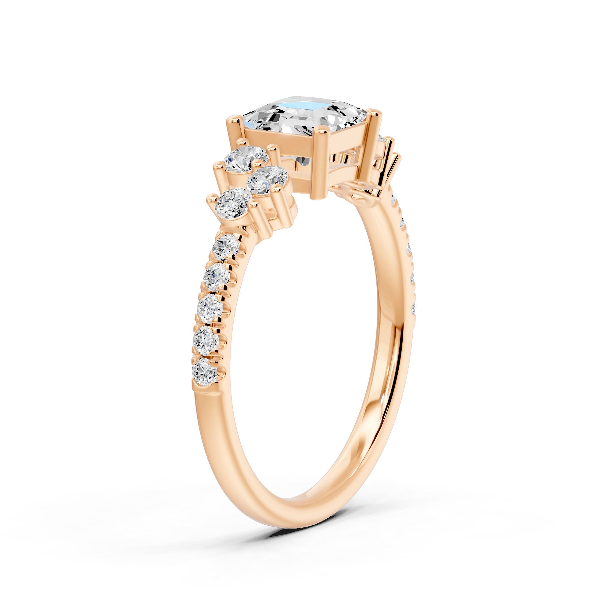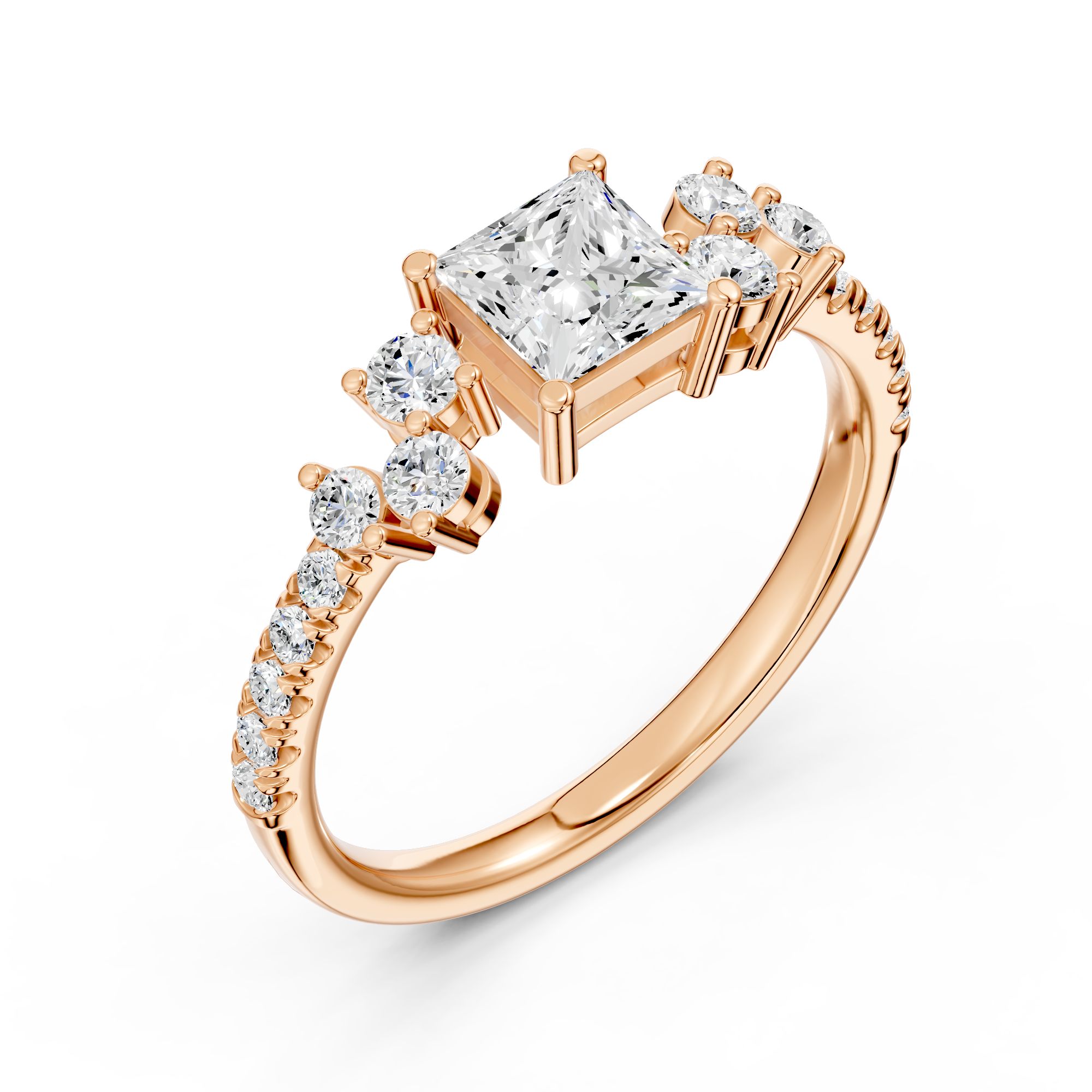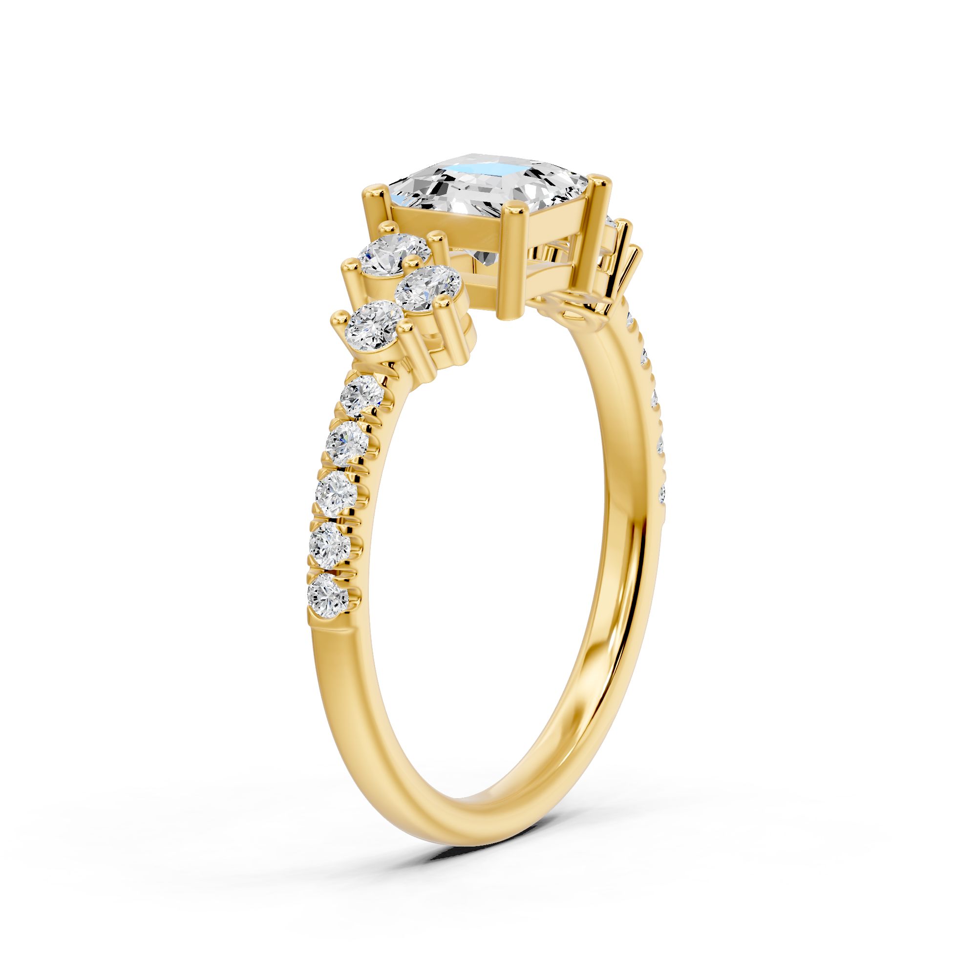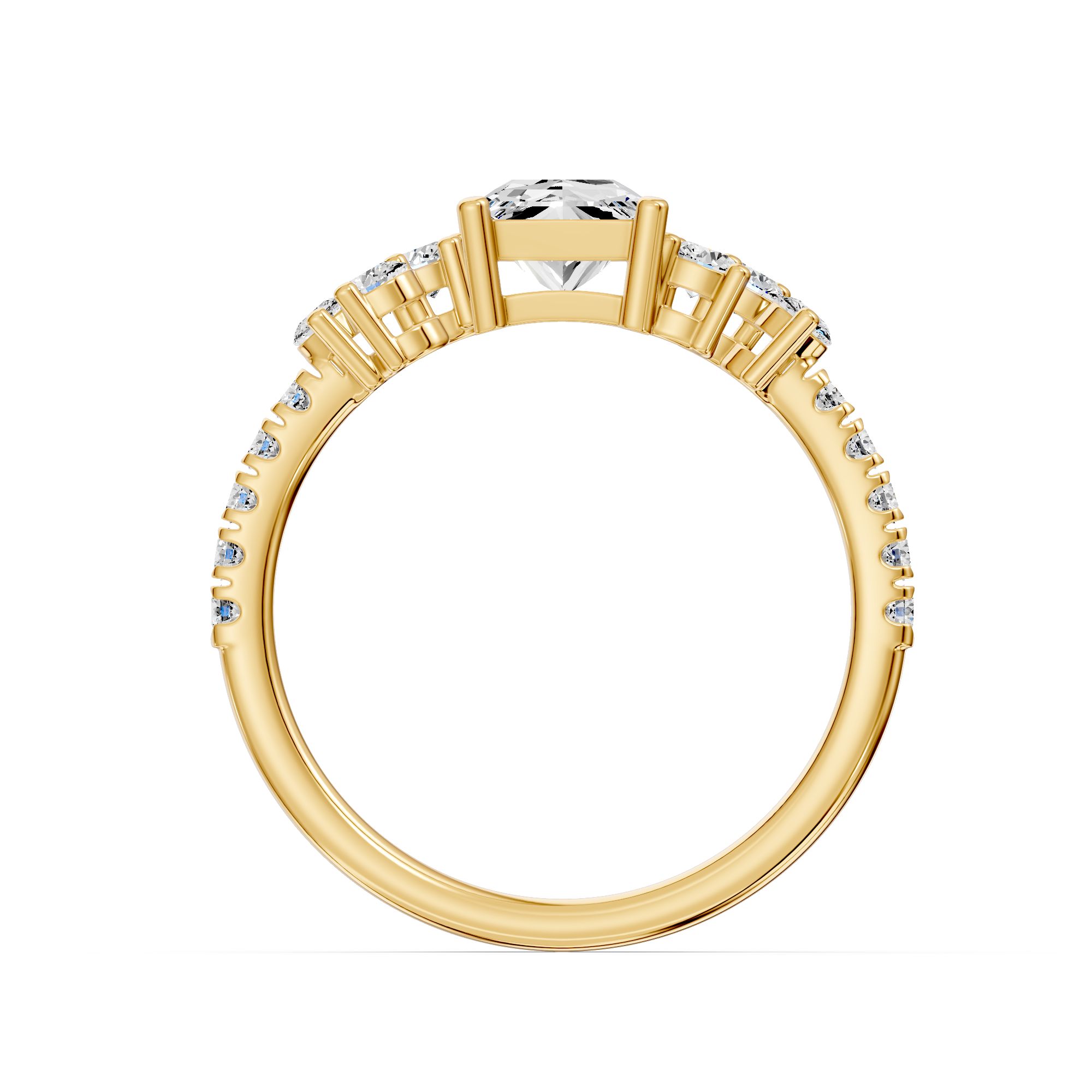 Crafted in gold, this elegant engagement ring features a striking princess-cut diamond at its center, accented with shimmering side stones. A timeless design that blends modern sophistication with classic brilliance.