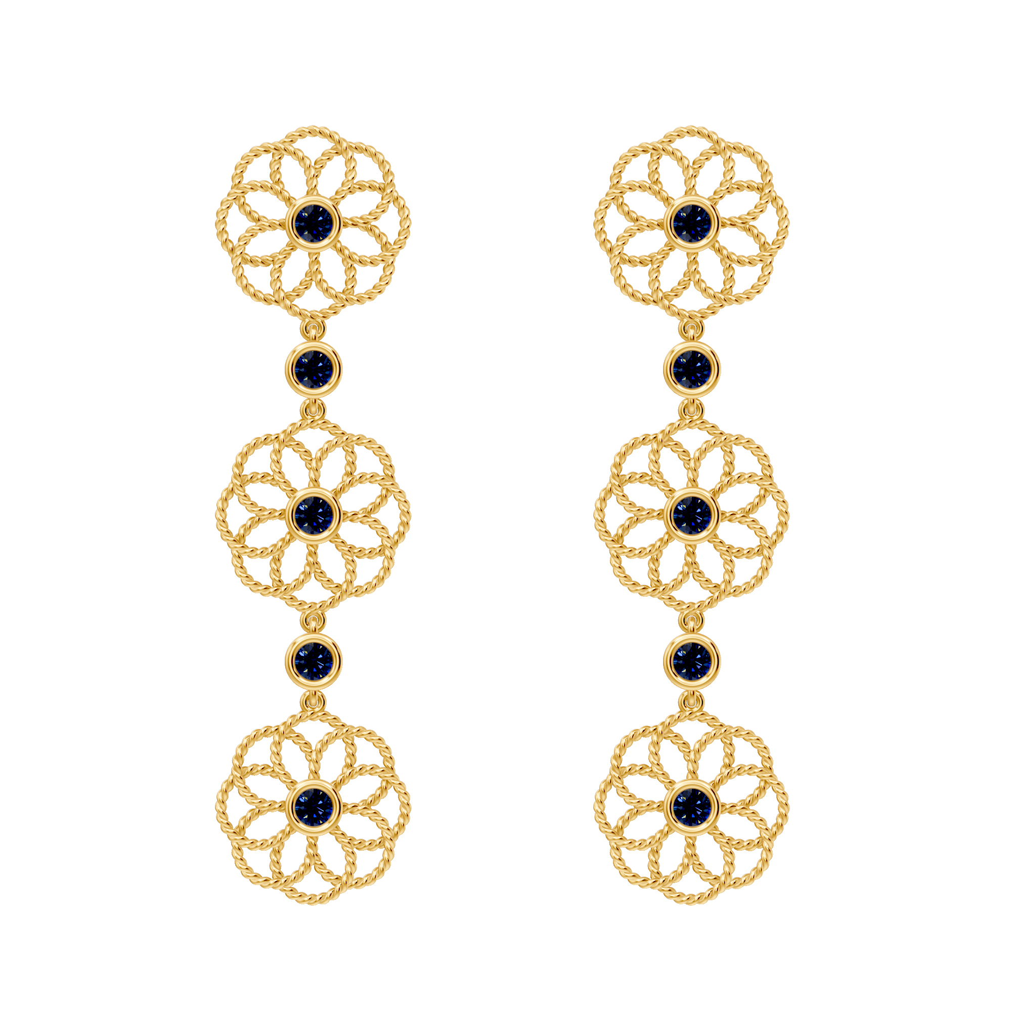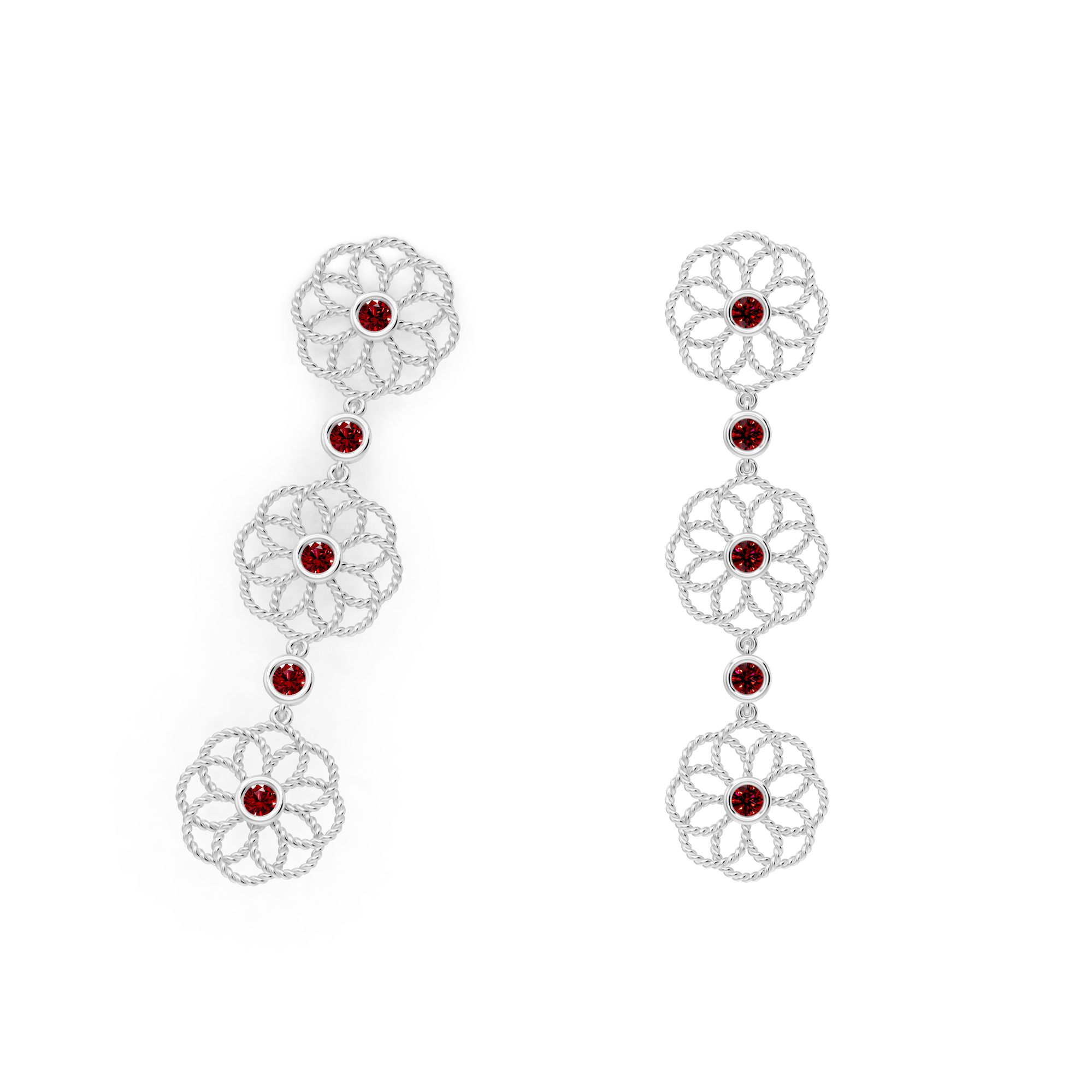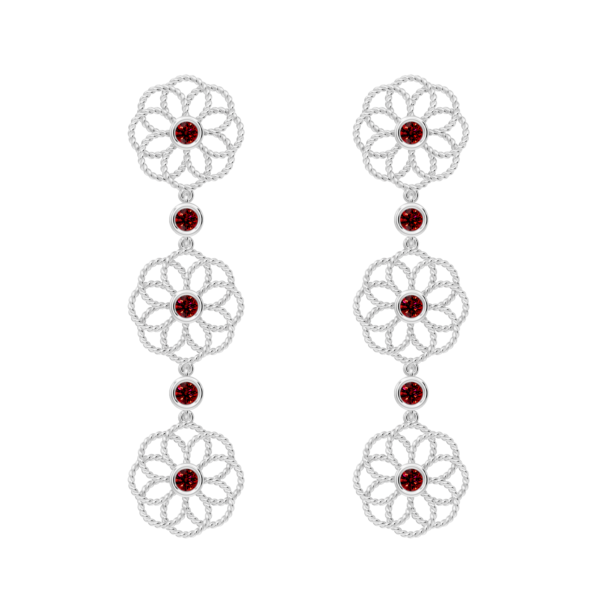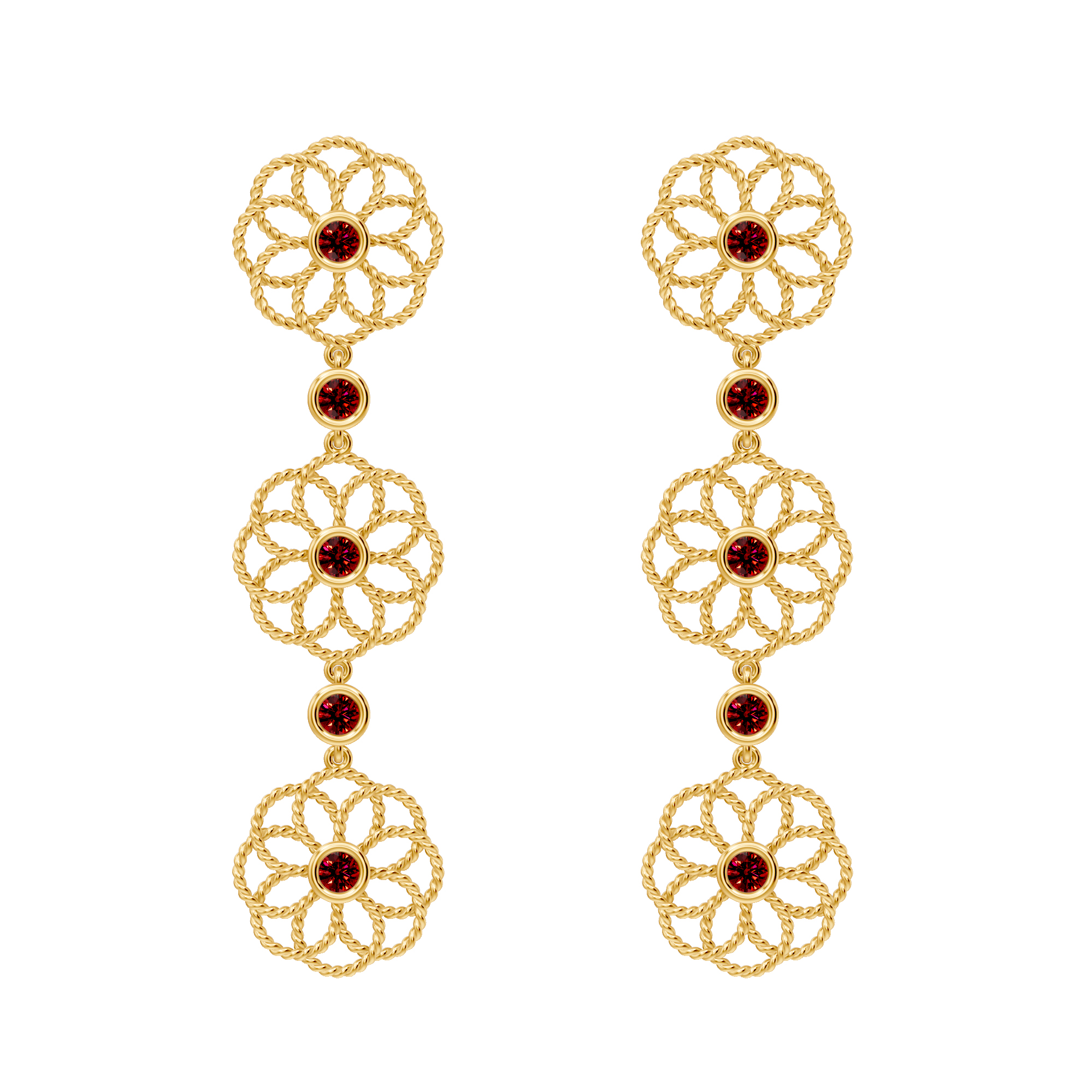 Elegant gold earrings featuring three linked floral motifs with ruby-toned centers, blending traditional charm with modern grace—perfect for festive and evening wear can be paired with matching bracelets and ring