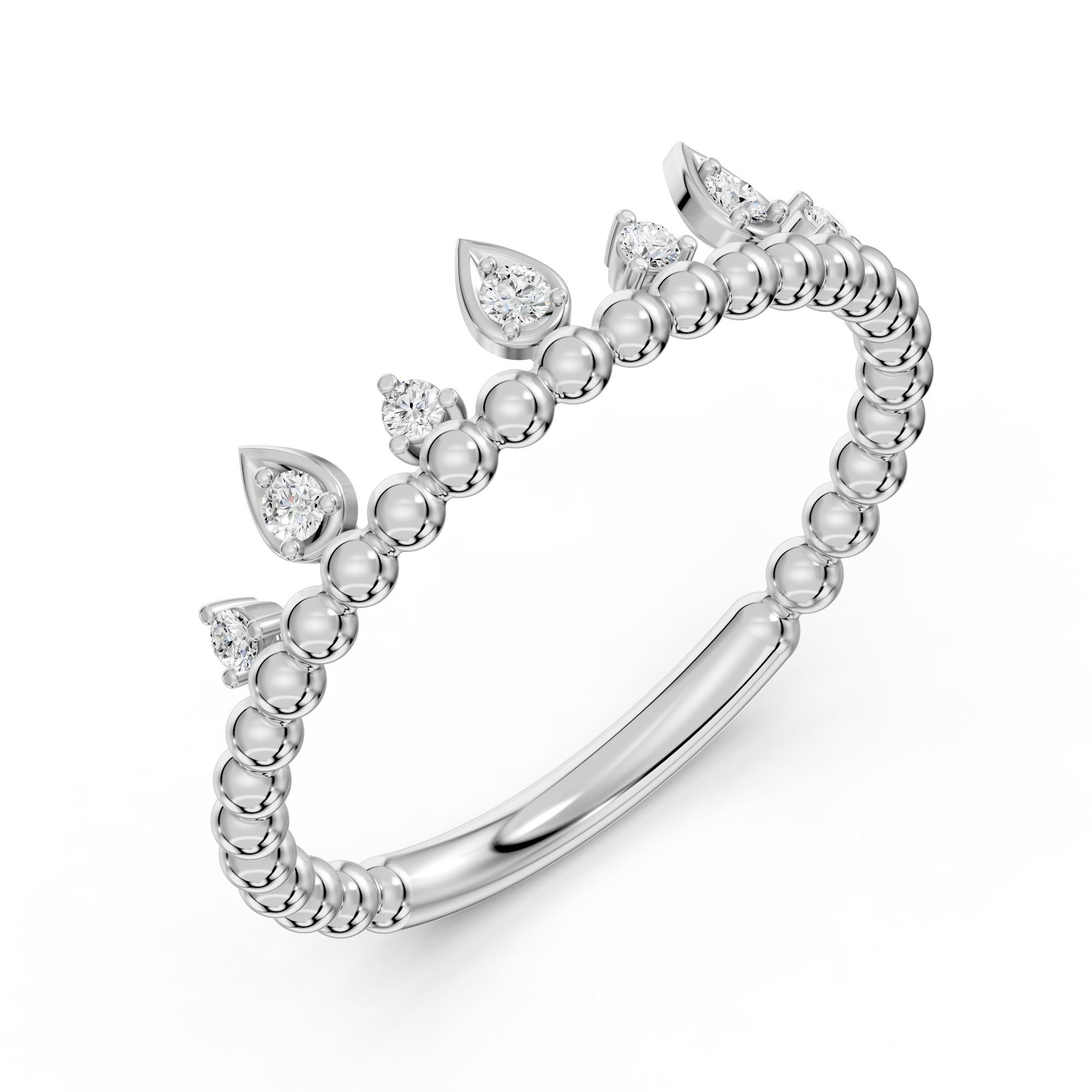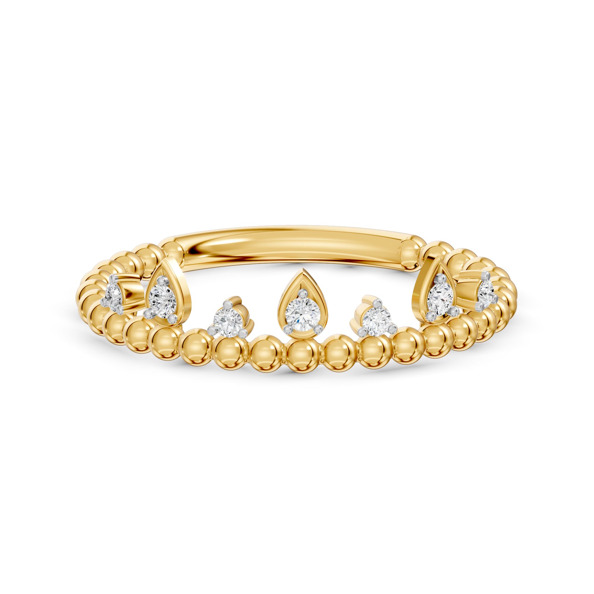 The Starlit Crown Ring is a delicate gold band adorned with shimmering round diamonds, prong-set to resemble a crown glistening under starlight.
